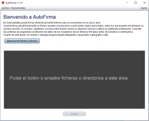 - Executem l’aplicació “AutoFirma” i arrosseguem el fitxer a signar a l’àrea o fem clic en “Seleccionar fitxers a signar”.