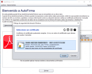 - Seleccionem el certificat prement en “Acceptar” si es tracta del correcte amb el qual volem signar.