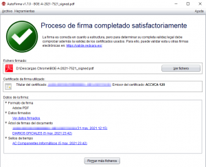 - Si el procés de firma del fitxer s’ha completat satisfactòriament ens apareixerà la següent finestra informativa i podrem obrir el fitxer per a visualitzar-lo.