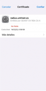 Una vez nos hayamos identificado con nuestras credenciales de usuario, aparecerá la pantalla de validación del certificado. Pulsar “Confiar” y estarás conectado a la red wifi que hayas elegido “iumhnet o eduroam”.