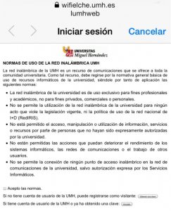 - Iumhweb: Conexión abierta (sin seguridad) para ser utilizada por aquellas personas que no poseen usuario/contraseña de dominio o DNI/Pin de estudiante y que están en la UMH de visita. Utilizando Iumhweb tendrás que repetir el proceso de validación cada vez que te conectes.