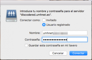 smb://discodered.umhnet.es/qy_xxx$dondexxxserá el nombre de la carpeta. A continuación, haremos clic sobre el símbolo + para añadirla a favoritos. Para finalizar, le daremos a Conectar.