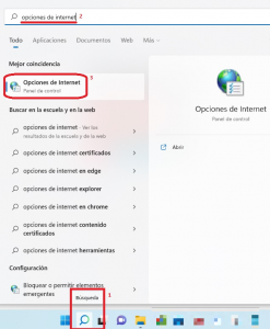 1. En la barra inferior seleccionaremos la Lupa, a continuación escribiremos «Opciones de Internet». Después tendremos que hacer clic de ratón sobre la aplicación «Opciones de Internet».