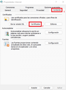 2. En la ventana «Propiedades: Internet» seleccionaremos la pestaña «Contenido» y después pulsaremos sobre el botón «Certificados».