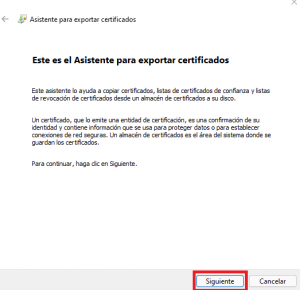 4. Esto iniciará el Asistente para exportar certificados, simplemente haremos clic en «Siguiente».