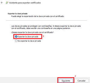 5. Ahora seleccionaremos «Exportar la clave privada» y pulsaremos en siguiente. Si esta opción no está disponible, revisar la nota al final de este artículo.