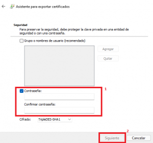 7. Ahora marcaremos la opción «Contraseña» y definiremos una. Después seleccionaremos «Siguiente».