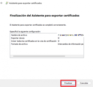 10. Ya hemos finalizado la exportación del certificado, solo nos queda pulsar sobre el botón «Finalizar» para terminar el proceso.