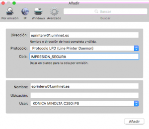Si deseas instalar una impresora del servicio del servicio de impresión centralizada de la Universidad Miguel Hernández, en un equipo con macOS, siga los siguientes pasos.