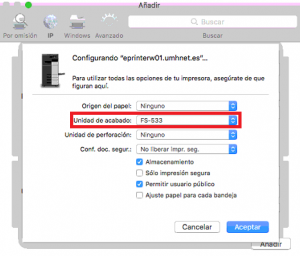 11. Nos aparecerá la siguiente ventana, para poder utilizar la unidad de grapado, seleccionaremos «FS-533» en Unidad de acabado, y pulsaremos en Aceptar: