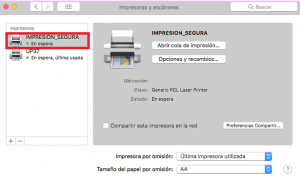 12. Ya hemos terminado de añadir la impresora «IMPESION_SEGURA» en nuestro sistema y ésta ya aparecerá en nuestro listado de impresoras disponibles:
