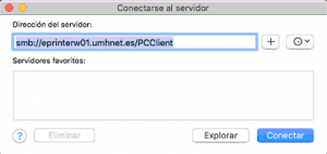 2. Ahora en el campo Dirección del servidor escribiremos «smb://eprinterw01.umhnet.es/PCClient» y pulsaremos en conectar :