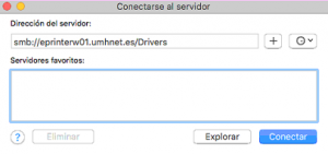 2. Ahora en el campo Dirección del servidor escribiremos «smb://eprinterw01.umhnet.es/Drivers/» y pulsaremos en conectar :